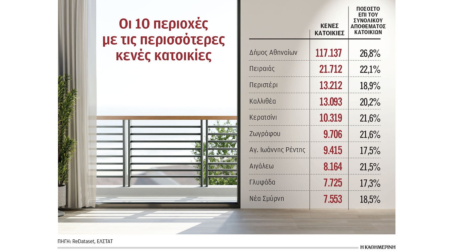 Έχουμε ξαναγράψει πως δεν μας λείπουν τα σπίτια, αλλά μας λείπουν τα κατοικήσιμα σπίτια. Στον Δήμο Αθηναίων πάνω από 117.000 κατοικίες (26,8% του συνόλου) είναι κενές, ενώ στον Πειραιά τα κενά σπίτια φτάνουν τα 21.700 (22,1%). Ακόμα και στην Κηφισιά, το 18,4% των κατοικιών (6.441 συνολικά) είναι κενές. Παρά τα φορολογικά κίνητρα και προγράμματα όπως το «Ανακαινίζω – Νοικιάζω» (μόλις 50 εκατ. ευρώ), εκτιμάται ότι περίπου 250.000 κατοικίες πανελλαδικά είναι σήμερα μη κατοικήσιμες λόγω χρόνιας υποεπένδυσης 35 δισ. ευρώ σε συντήρηση, κάτι που περιορίζει δραστικά την πραγματική προσφορά στέγης.