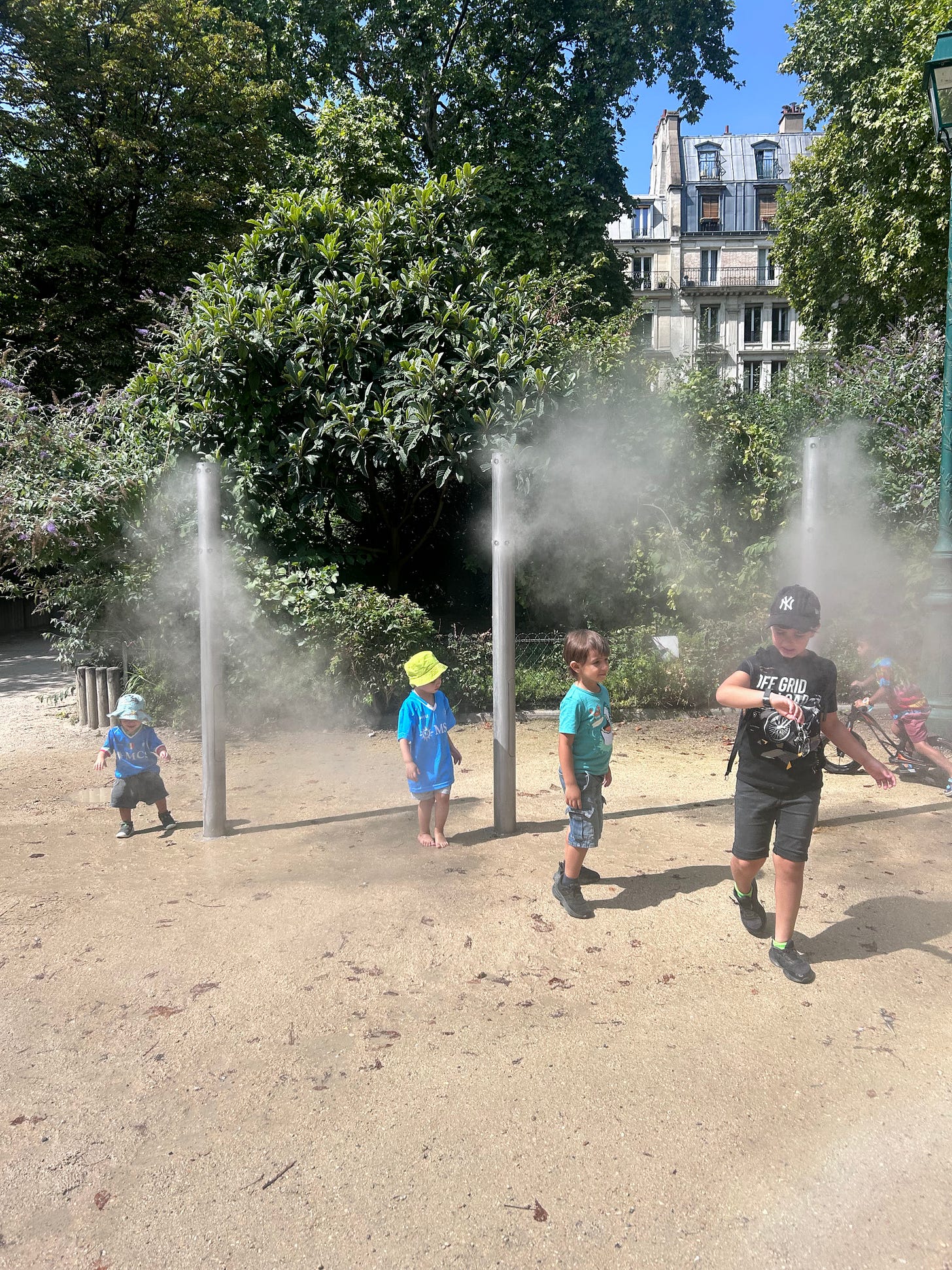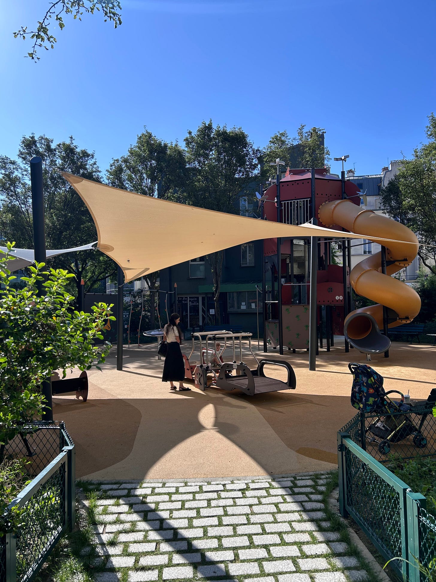 Μετά το πρωινό, σειρά είχε η παιδική χαρά. Παρότι Αύγουστος στην πόλη με 30 βαθμούς, η παιδική χαρά ήταν λειτουργική και γεμάτη όλη μέρα. Αυτό ήταν εφικτό χάρη σε δύο επαναστατικές τεχνολογίες. Νερό και πανιά.