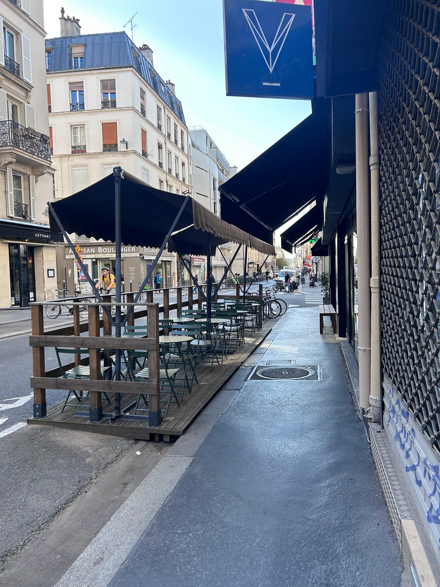 Τα καταστήματα εστίασης είχαν φυσικά τραπεζάκια έξω, αλλά αυτά ήταν τοποθετημένα στον δρόμο και όχι στα στενά πεζοδρόμια. Οι θέσεις στάθμευσης που μετατρέπονται σε ξύλινες εξέδρες με τραπέζια και καρέκλες είναι, μετά τον covid, ο βασικός τρόπος εξάπλωσης της εστίασης στις περισσότερες σοβαρές πόλεις. Έτσι, το πεζοδρόμιο παραμένει άνετο για να περπατήσεις, δεκάδες άνθρωποι απολαμβάνουν το κρουασάν τους και ένας μόνο οδηγός δυσκολεύεται περισσότερο να παρκάρει.